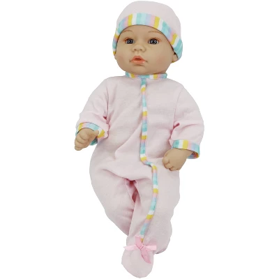 - Dressed in a soft pink footed sleeper and hat with stripe trim.