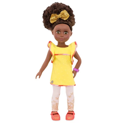 - 14-inch Doll: Nelly has curly brown hair, hazel eyes, long eyelashes, and she loves bright colors and butterflies!