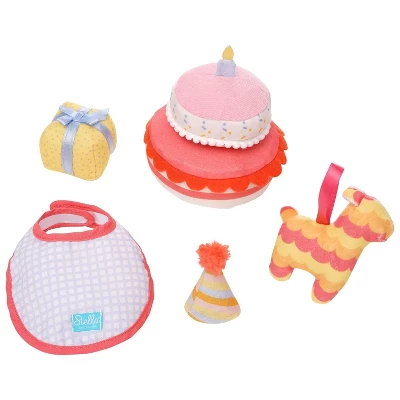 It’s time to party with the Stella Collection Birthday Party set! This playful six-piece accessory set includes all the makings for a fun-filled birthday celebration: two-layered soft toy cake that separates into two pieces (top and bottom), a fabric bib that adjusts to fit both Baby Stella and Wee Baby Stella dolls, a soft toy gift with ribbon, felt-like fabric party hat with pom-pom and elastic strap, soft toy llama piñata with ribbon loop and a sturdy birthday card that says “Happy Birthday”! It’s the perfect playset for Baby Stella and Wee Baby Stella fans alike, as all play accessories are compatible with both 15” and 12” soft dolls. Doll play encourages motor skill development, nurturing role-play, and language skills as littles enjoy talking to their babies..