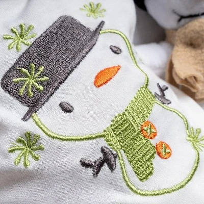 She wears an adorable knit jersey frosty top with an embroidered snowman and little snowflakes and cream and taupe striped hooded sweater with playful 3D ears on top! White fleece leggings keep her warm, but she also has knit ruffled shorts for warmer days. Baby Kione is ready for a fun day with her little snowman friend by her side!